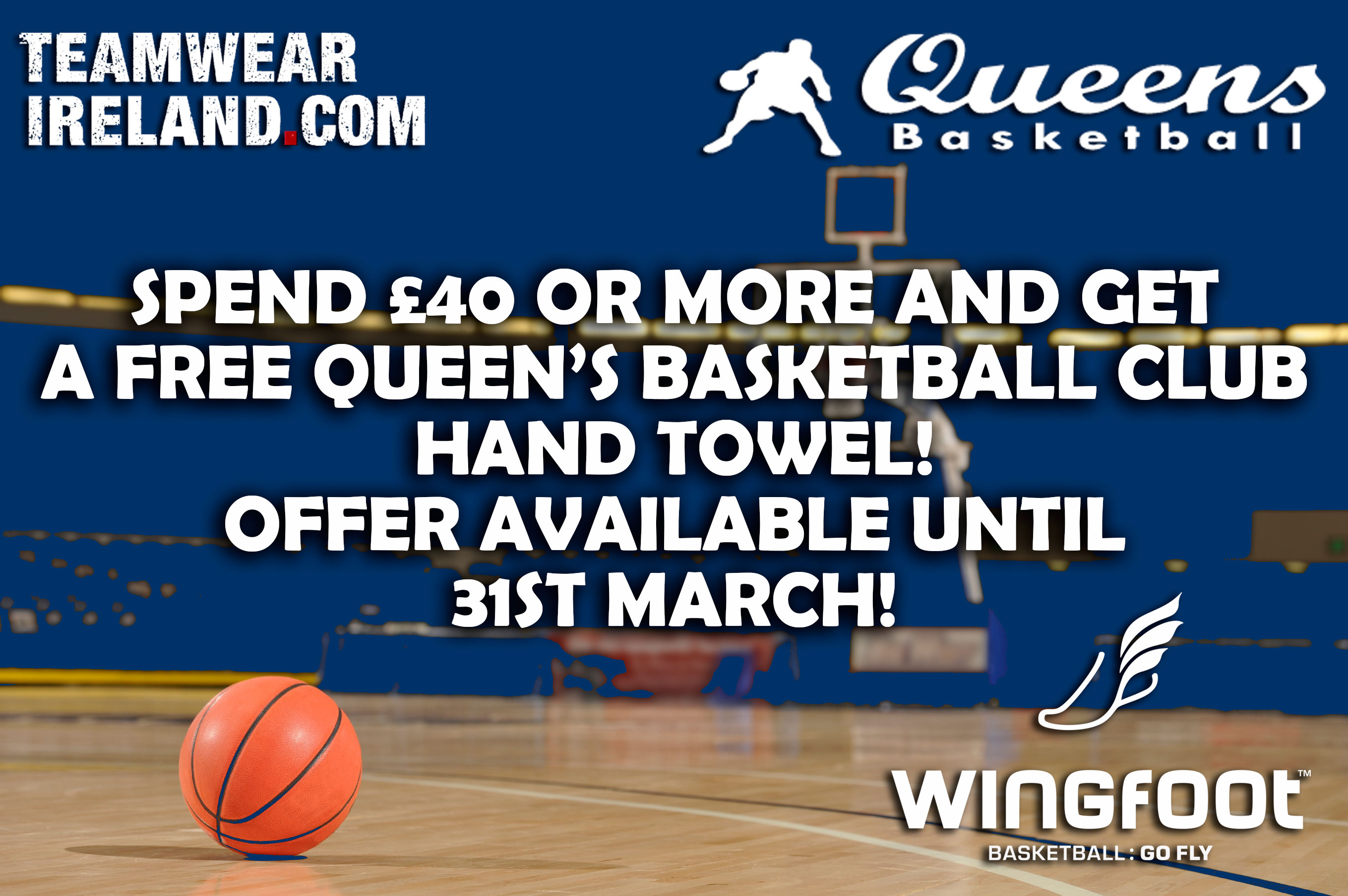 Spend £40 or over and receive a FREE Queen's Basketball hand towel worth £15.00, until 31st March.